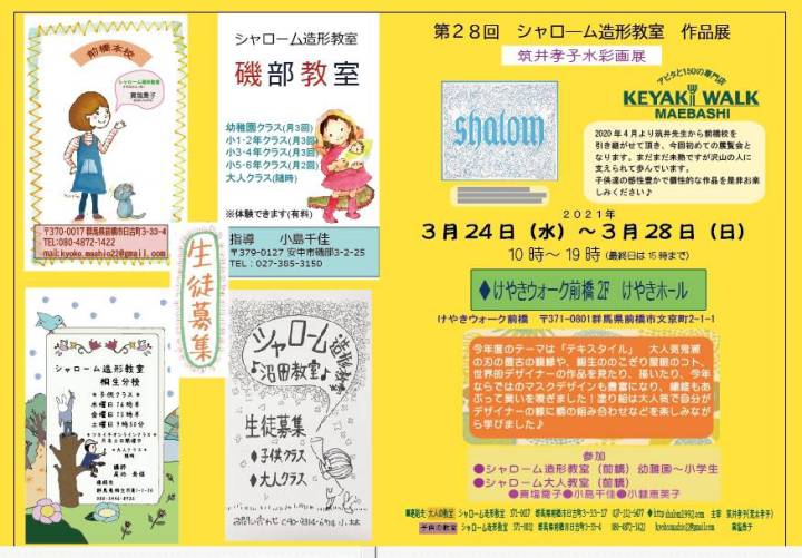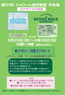 | 第27回 シャローム造形教室 作品展 筑井孝子水彩画展 ●延期 日時 2020年 3月25日(水)~3月29日(日) 10時~7時まで(最終日4時まで) 場所:前橋けやきウォーク2階けやきホール 371-0801 群馬県前橋市文京町2-1-1 |