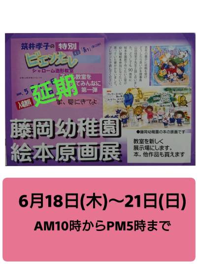 藤岡幼稚園原画展 本の販売もいたします。一冊1000円ですが 半額で販売 また特別販売もしますのでお楽しみに 駐車場は隣の水色の家にもおけます |