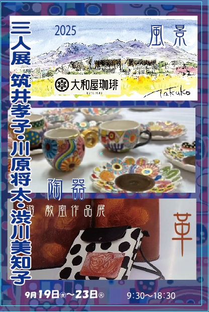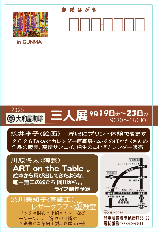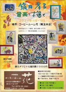 | 「筑井孝子 音楽を描く」 ●2021年1月~3月 「コーヒールーム花」 ●親玉商店の場所はこちらでわかります 「カフェで商品を買った方には 前橋の「朔太郎音楽祭のはがきセット」 もらえます。 ●作品はこちらから見れます |