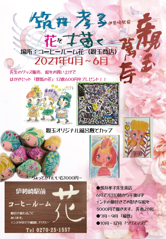 | 「筑井孝子 花を描く」 ●2021年4月~6月 「コーヒールーム花」 ●親玉商店の場所はこちらでわかります 「カフェで商品を買った方には 「群馬の花々」のはがきセットもらえます ●ブログはこちら |