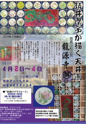 | 第2回 高崎龍源寺天井画 お披露目会 日時 2020年4月2日(木)~4日(土) 10時~17時 場所 龍源寺 高崎市吉井町多胡776 ⁂開催予定です。 変更がありましたらまたお知らせ致します。 ●お披露目は期間限定です。 この機会をお見逃しなく! |